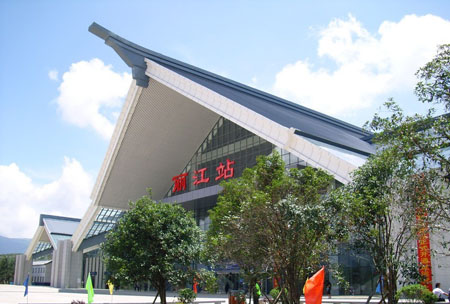 丽江火车站位于大丽铁路(大理-丽江)线上,是大丽铁路的终点站。它位于云南西北部的丽江市,是云南省第二大火车客运站。由西南交通大学建筑勘察设计研究院设计,2011年8月18日,正式投入使用。新丽江站建筑设计具有鲜明的纳西族风格和特点。站房面积11821平方米,建筑高度32.50米,长182米,宽50.3米,站房内设贵宾候车室、消防设施、应急疏散通道、广播、通信、无障碍通道等。新丽江站两个候车室共设1200个坐椅,乘客可由一楼候车室进站通道进入二、三站台,或由二楼候车室天桥直接进入一站台。