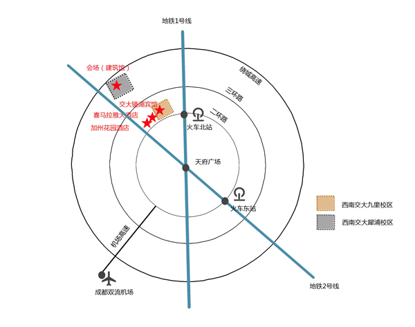 也可叫出租车从酒店到西南交大犀浦校区西二门,约30-40分钟,下车后步行5-10分钟到建筑馆会场。