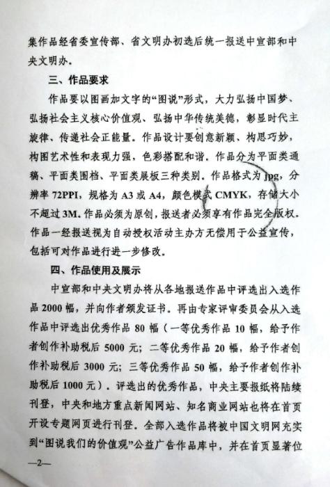 作品要求:作品主要以图画加文字的“图说”形式,大力弘扬中国梦,弘扬社会主义核心价值观,弘扬中华民族传统美德,彰显时代主旋律,传递向上向善的价值追求。作品设计要创意新颖、构思巧妙,构图艺术性和表现力强,色彩搭配和谐。作品格式为jpg,分辨率为72PPI,规格为A3或者A4,颜色模式CMYK,储存大小不超过3 M。作品必须为原创,报送者必须享有作品完全版权。作品一经报送视为自动授权活动方无偿用于公益宣传,包括可对作品进行进一步修改。