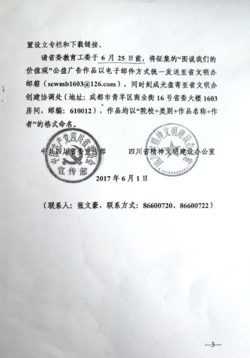 请按照文件要求结合学院专业特点根据推选标准和工作要求。积极推荐符合条件的优秀作品。请于2017年6月22日前将电子版材料发送至四川省委教育工委宣思处邮箱:szc610041@163.com。主题同意命名为“西南交通大学+作品名”