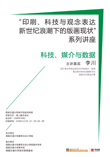 今年与“第五届四川版画提名展”同时举办的四场学术讲座,由西南交通大学建筑与设计学院主办,西南交通大学建筑与设计学院美术学系、西南交通大学美术馆、西南交通大学扬华美育基地承办,以“印刷、科技与观念表达——新世纪浪潮下的版画现状”为学术主题, 着力探索在“后印刷时代”,作为技术、观念的媒介将为作为传统印刷的版画创作带来怎样新的挑战和机遇。