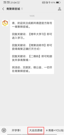 步骤一:关注“青聚锦官城”微信公众号,点击下方“大运志愿者”。