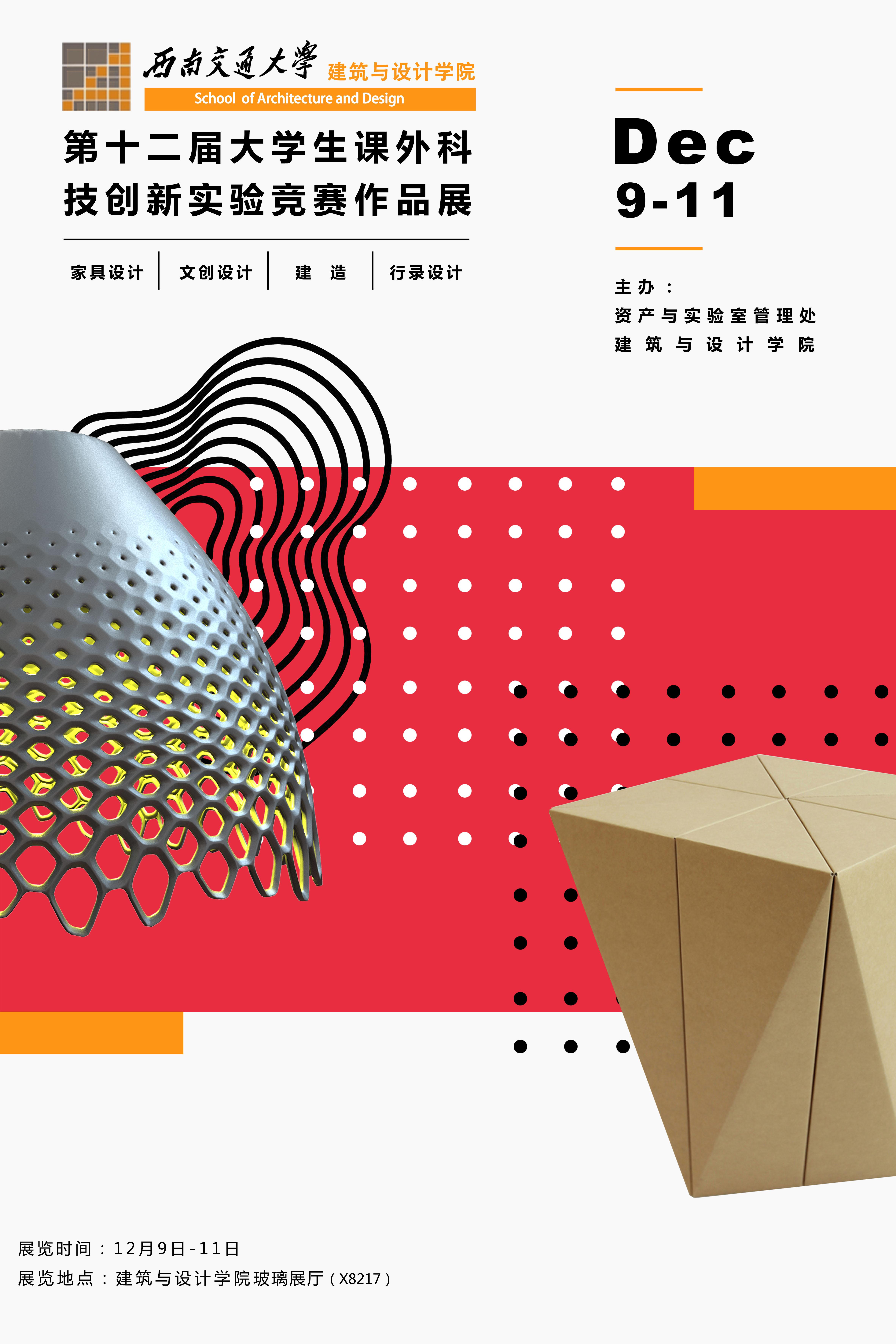 由资产与实验室管理处、建筑与设计学院主办的我院第十二届大学生课外科技创新实验竞赛即将落下帷幕。竞赛作品包括家具设计、文创设计、行录设计和建造类作品四大版块,于2020年12月9-11日在八教玻璃展厅(X8217)展出,欢迎老师同学们莅临观展。