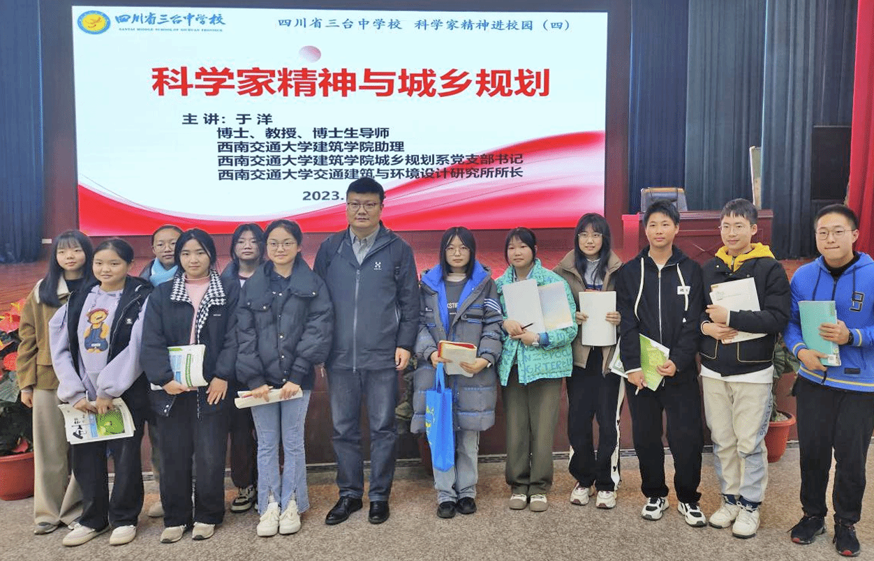 12月8日,伟德体育官网于洋教授应邀赴绵阳市普明中学、三台中学两所百年中学开展科普讲座,宣讲弘扬科学家精神。两所学校千余名学生参加了本次活动。于洋教授的讲座主题是“科学家精神与城市规划”。他首先采用丰富的图片和详实的材料,生动地讲述了钱学森、黄旭华、屠呦呦、南仁东等科学家科学救国、科研报国、科技强国的非凡历程,深入阐释了爱国、创新、求实、奉献、协同、育人的科学家精神,强调中学生应该具备专注精神、求实精神和创新精神。