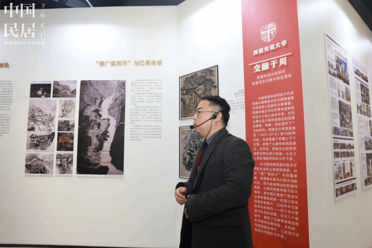 本次展览邀请国内17所知名高校进行共创,将众多学术研究成果以更通俗的形式面向公众展示。其中西南交通大学受邀参展的主题是“交融于川“,将民居对应于不同的社会风土和移民族群,分为“湖广填四川”与巴蜀场镇、皖西南大屋与川西大宅的对比、四川盆地周边的防御性民居、从胡同到宽窄巷子四大板块。
