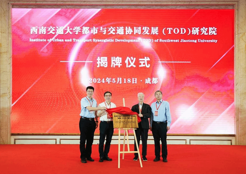 在国内外500余名学者专家的见证下,孙永福院士、杨丹主席、闫学东校长、王平副校长共同为“西南交通大学都市与交通协同发展(TOD)研究院”揭牌。