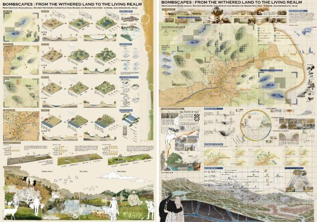 伟德体育官网一等奖的作品《BOMBSCAPES:FROM THE WITHERED LAND TO THE LIVING REALM》聚焦伊拉克库尔德斯坦地区战后遗留弹坑问题,选取Halgurd-Sakran National Park区域作为研究对象,面对当地战争后土地破损、严重缺水、环境恶劣的条件,通过利用战后遗留弹坑构建区域水网系统,实现水资源的收集与利用,以此恢复多种生境进而与产业结合,将原本被战争侵蚀、残破不堪的场地重新赋予生机,实现当地生产、生活和生态环境的可持续发展。