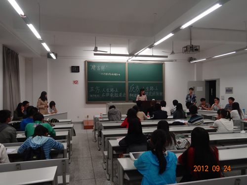 2012年9月24日晚7点半,伟德体育官网“建言杯”新生辩论赛第一场在西南交大犀浦校区建筑馆X8526如期打响。此次比赛邀请到了宁鹏,周庆,肖洒,马维思,陈蒋靖5位往届的优秀辩手作为评委出席。