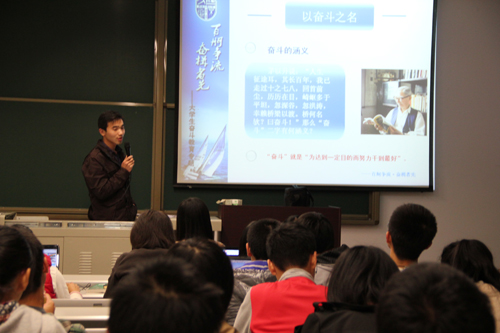 茅以升说:“人生一征途耳,其长百年,我已走过十之七八,回首前尘,历历在目,崎岖多于平坦,忽深谷,忽洪涛,幸赖桥梁以渡。桥何名欤?曰奋斗!”那么“奋斗”对大学生当作何解释?10月24日晚7点半,新生辅导员段玉全老师给2012级本科新生带来了一场题为“百舸争流 奋楫者先”的奋斗专题教育讲座。