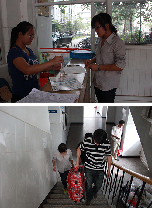 7点半左右,伟德体育官网第一位2013级新生在家长的陪伴下来到了迎新点。新同学在负责接待同学的帮助下进行身份核对,快速查询班号、寝室号,领取一卡通等手续。负责迎新的同学还详细而耐心的向新同学讲解报到的流程,并由专门的同学负责带领新同学去办理入住手续。迎新工作紧张而有序的开展着。