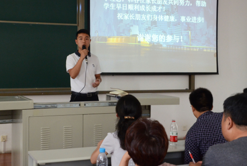 辅导员王少婧老师和新生辅导员方翰老师就学生日常管理实务及《本科生教育规范》向家长们做了详细说明。希望通过本次讲解,让家长更多的了解学校的规章制度,以便于辅导员和家长有更好的沟通交流,共同为学生的学习、生活做好保驾护航工作。同时学生工作组为让新生家长们也能及时沟通联络,利用现代网络平台,为新生家长们也搭建起沟通的桥梁---创建了2013级新生家长QQ群。同时学院也积极利用新生家长QQ群转发学校、学院等相关通知以及学生在校情况、成绩等,这样也能做到家长与学生接收信息同步性、统一性,让学生家长在第一时间了解到学生的信息。
