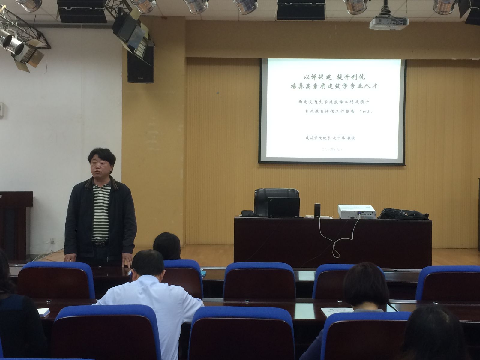 学院沈中伟院长强调了本次评估工作的重要性和重要意义,肯定了教职工及学生在本次评估准备工作中的辛勤付出和工作成果,同时也指出了评估前准备工作中存在的细节问题。并做了“以评促建提升创优”培养高素质专业人才的专题报告。报告中,沈院长全面分析了国内高校建筑学科评估形势,概括了我院近几年在办学实力、学术研究等方面取得的进步和骄人成果,指出了当前存在的不足之处,明确提出了今后发展方向和目标。