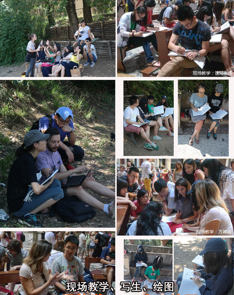 每天的学习,学员们学习两种设计创意表达方法。一种是罗马设计师的基础——身体测绘。放弃通常设计教育中的尺规测绘,罗马艺术系教授教大家用自己的脚步和最简单的铅笔(步测法)来绘制出罗马街道、广场或建筑的平面图、立面图和剖面图。通过这种艺术的感性认知方式,大家增强了自身对空间的敏感度。最后像艺术家一样,通过绘图将自己的所见、所感表达出来。另外一种方法则是细节绘画,仔细观察是发现细节的方法。观察是一种复杂的艺术,真实感、光、材质、间距、视觉分组、视觉构成……提高了大家的观察力。这种方法将让同学们了解到千百年来罗马建筑师一直探讨的问题:如何保持建筑的与众不同,又能够天衣无缝地与环境融为一体。细节绘画与身体测绘一起告诉学员们,建筑和所有艺术一样,是可以睁大眼睛仔细分析的,又是可以闭上眼睛忘情感知的。