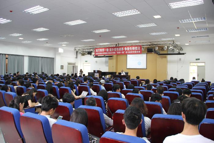 党课中,栗民书记指出:为深入学习贯彻习近平总书记系列重要讲话精神,推动全面从严治党向基层延伸,巩固拓展党的群众路线教育实践活动和“三严三实”专题教育成果,进一步解决党员队伍在思想、组织、作风、纪律等方面存在的问题,保持发展党的先进性和纯洁性,党中央决定,2016年在全体党员中开展“学党章党规、学系列讲话,做合格党员”学习教育。所以开展“两学一做”学习教育,是面向全体党员深化党内教育的重要实践,是推动党内教育从“关键少数”向广大党员拓展、从集中性教育向经常性教育延伸的重要举措。因此,本次“两学一做”的总体要求是党员教育向经常性教育延伸,以习近平总书记系列重要讲话精神武装全党,加强看齐意识教育,落实党员教育管理制度等四个方面,在“两学一做”学习教育要求下我院积极响应,荣幸地邀请到了联系我院的分管校领导张兵总会计师为我院全体师生党员进行党章系列学习《党的最高纲领和最低纲领》专题讲座。