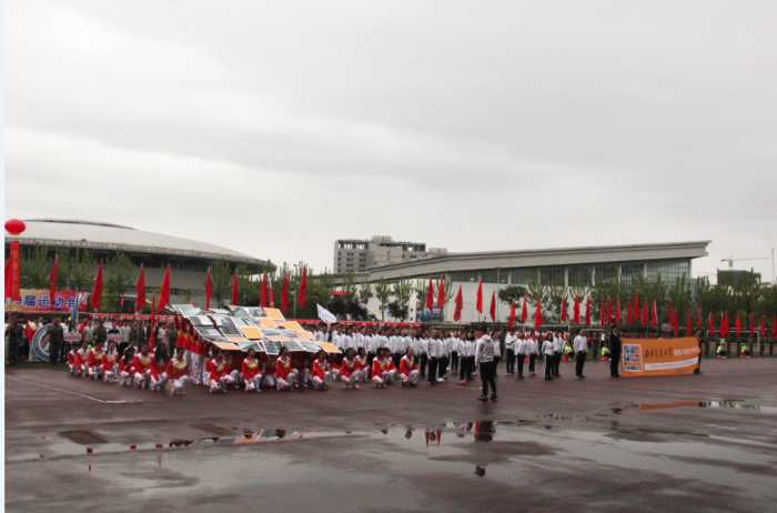 在激昂的运动员进行曲中,开幕式正式开始,我院师生方阵神采飞扬,英姿勃发地向主席台走来。方阵迈着整齐的步伐在主席台正前方站定,面向主席台整齐划一地举起手中展板,拼合出我院橙灰相间的学院标志,在整齐的口号中向全校师生展现了我院昂扬向上充满活力的精神面貌。与此同时,观众席上我院学生全体起立,齐声喝彩,鼓声轰鸣,欢呼声口哨声此起彼伏,在小雨初歇后的凉爽空气中展现了似火激情。