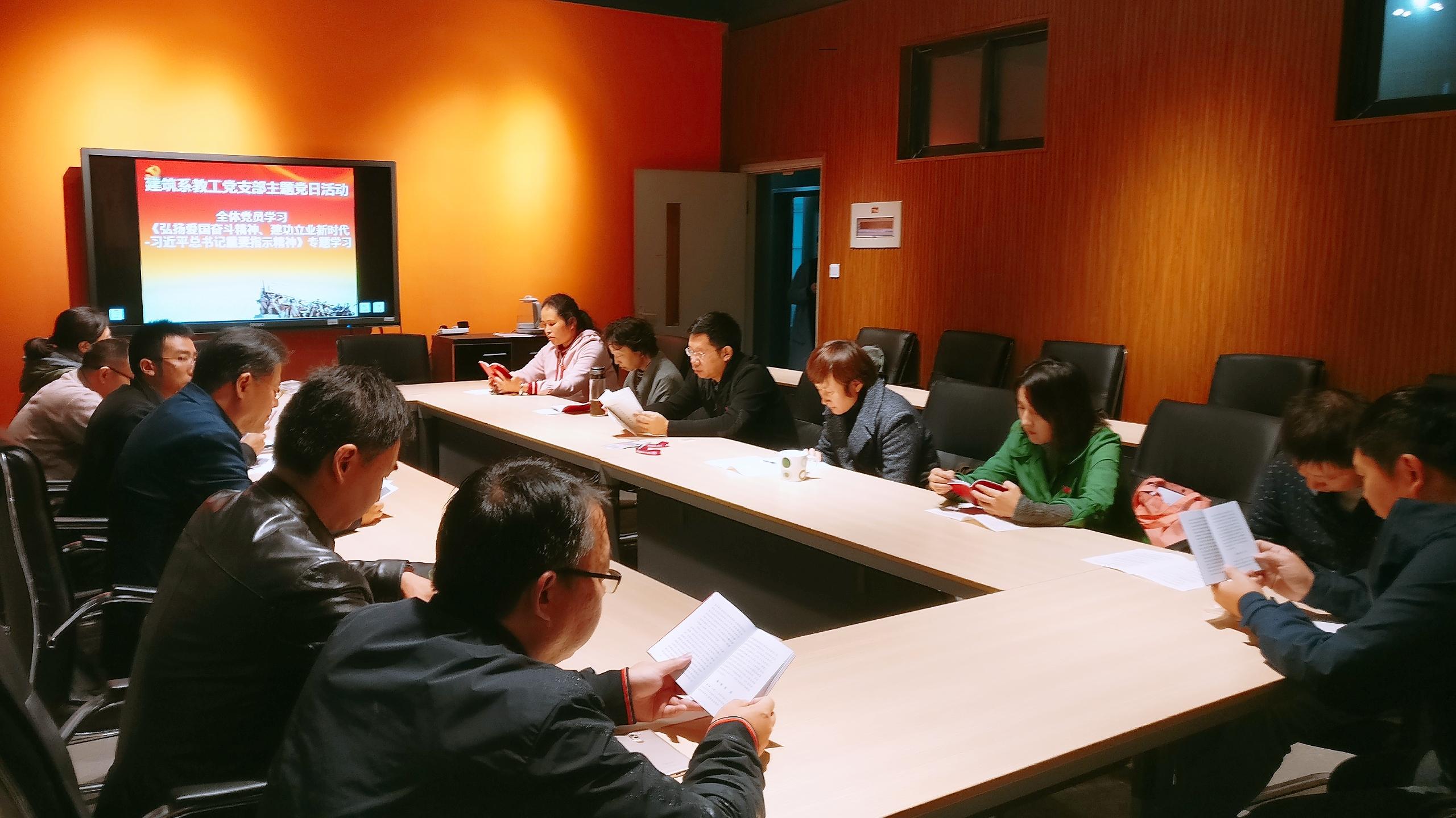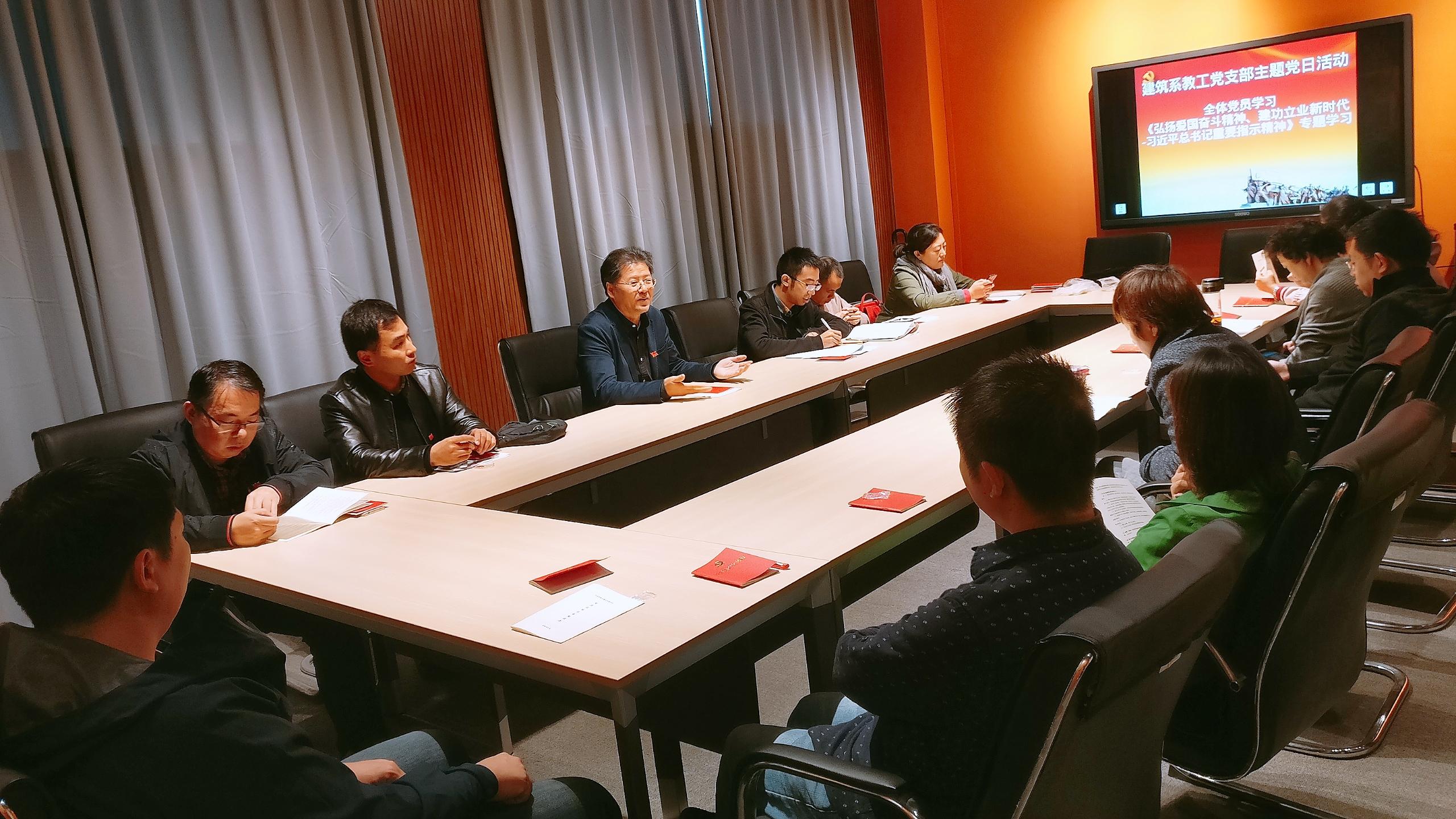 2018年10月18日,建筑与设计学院建筑系教工党支部在建筑系会议室召开支部会议,会议由党支部书记付飞同志主持。会议先对党章的第五章内容进行了学习,大家轮流朗读党章内容,对党章内容进行深入的理解,领会党章的要义。学习完党章之后,建筑与设计学院建筑系教工党支部开展《弘扬爱国奋斗精神、建功立业新时代——习近平总书记重要指示精神》专题学习:爱国奋斗,是中华民族生生不息代代相传的民族基因,是新时代高扬的主旋律;中国特色社会主义进入新时代,弘扬爱国奋斗精神具有特别重要的现实意义。大家认真学习习近平总书记重要讲话精神后,认为在中国特色社会主义新时代应自觉弘扬践行爱国奋斗精神,不忘初心、牢记使命,要增强“四个意识”,坚定“四个自信”,把教师们的个人理想自觉融入国家和学校发展事业中。此次会议还学习了习近平总书记在全国教育大会上关于“坚持中国特色社会主义教育发展道路,培养德智体美劳全面发展的社会主义建设者和接班人”的重要讲话。同时,会议传达中共西南交通大学委员会关于学习贯彻教育部党组第三巡视组巡视工作动员会精神的通知,以及教育部党组第三巡视组巡视工作动员会上的动员讲话和校党委书记王顺洪同志在教育部党组第三巡视组巡视工作动员会上的讲话。会议党员充分讨论,最后建筑与设计学院党委书记沈中伟同志向全系党员提出要求,作为一名大学教师和一名党员,更应该发挥带头作用:即在生活中、工作中,形成模范带头作用,珍惜集体荣誉,坚持学术习惯和学术理想;在支部组织的学习活动后,教师党员应将学习内容、学习精神转化到具体的教学科研实践行动中,为身边的教师和学生们带去正能量,不忘初心,砥砺前行。