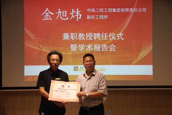 活动伊始,我院党委书记沈中伟介绍了金旭炜副总建筑师。金旭炜先生是现任中铁二院工程集团有限责任公司副总工程师,国家一级注册建筑师、教授级高级工程师。长期从事包括轨道交通、铁路等交通枢纽规划和建筑设计实践,曾参与完成成渝高铁、海南岛环线铁路、埃塞俄比亚亚吉铁路等数十项铁路项目的站房设计。沈书记表示,金教授在业界具有成绩斐然的卓越地位,故学校决定聘请金教授为我校兼职教授。