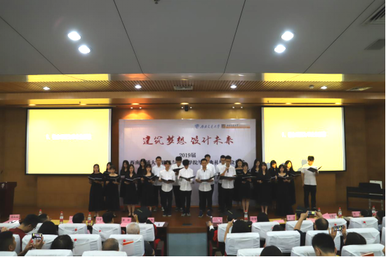 橙合唱团的同学们为毕业生献歌,两首《我爱你中国》和《那些花儿》引发全场共鸣,现场气氛温馨。最后,2019建筑与设计学院毕业典礼在齐声合唱的西南交通大学校歌《文轨车书郅大同》中画下句点。
