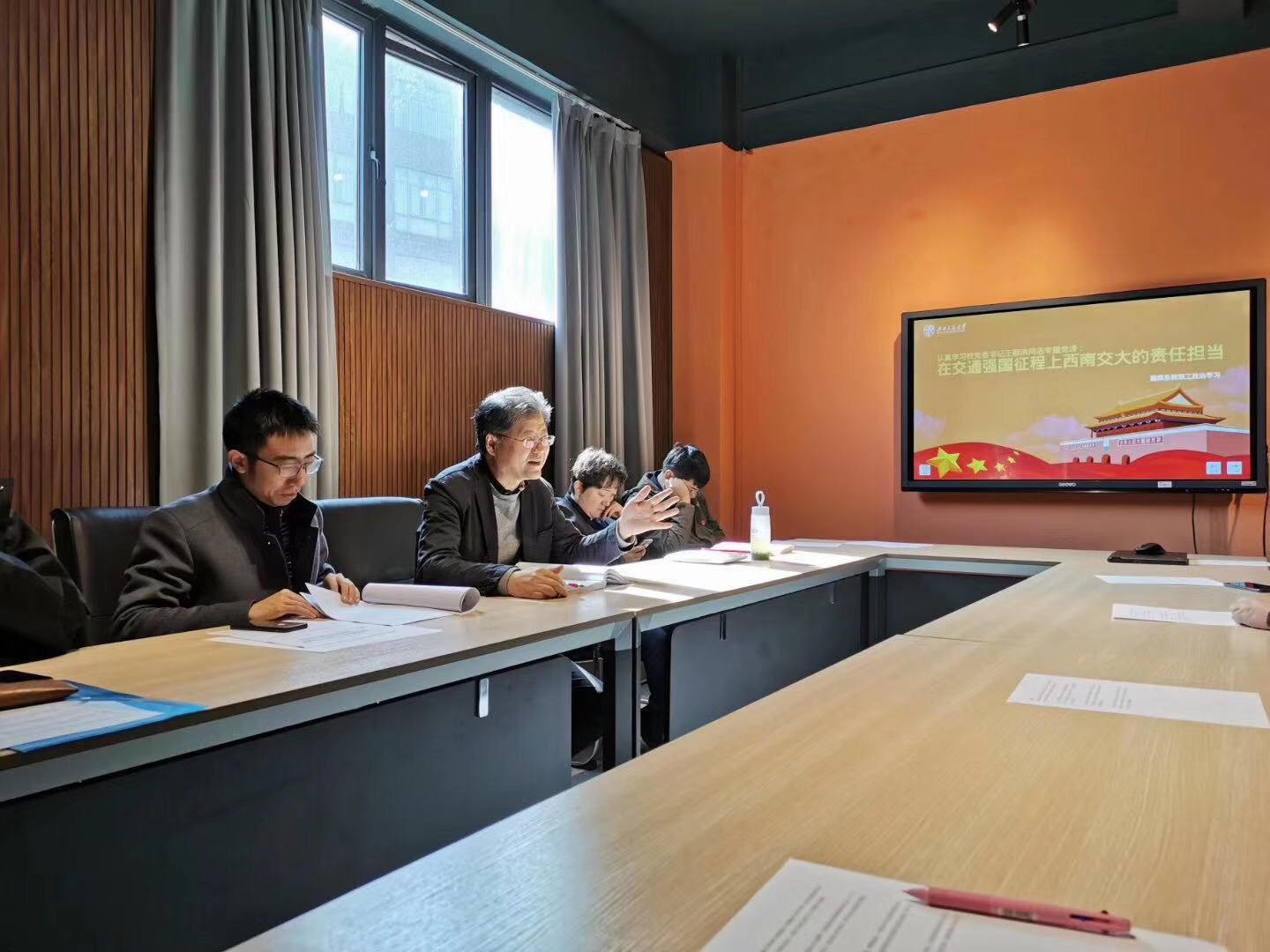 二、党委委员、执行院长沈中伟为支部党员将党课,作题为:《不忘初心、牢记使命为新时代建筑与设计学院教育事业发展贡献力量》的讲课,从中国共产党人的初心和使命、“不忘初心、牢记使命”的实施路径与具体要求,以及结合校党委书记王顺洪同志专题党课精神进行传达。共同学习校党委书记王顺洪同志以“西南交通大学在民族复兴征程上的责任担当”为题的“不忘初心、牢记使命”专题党课精神。在报告中王书记回顾了我国交通运输的发展历程,在不同历史时期我国轨道交通事业取得的重大成就。通过一个个鲜活的例子,展示了新中国成立70年来交大人在诸多“大国工程”中做出的努力和担当,反映出西南交通大学在123年的历史中,秉承“竢实扬华、自强不息”的交大精神,在新中国从“交通大国”走向“交通强国”伟大征程的责任与担当。号召全体党员同志,在民族复兴征程上,要主动把自己放到中国“伟大斗争,伟大工程,伟大事业,伟大梦想”的宏伟事业中去,思考人生,思考初心,思考使命,并对全校党员提出四点希望:一要自觉对标先进;二要站在实現中华民族伟大复兴中国梦的战略高度担当履职;三要以钉钉子的精神攻坚克难;四要为民多做事、做好事。