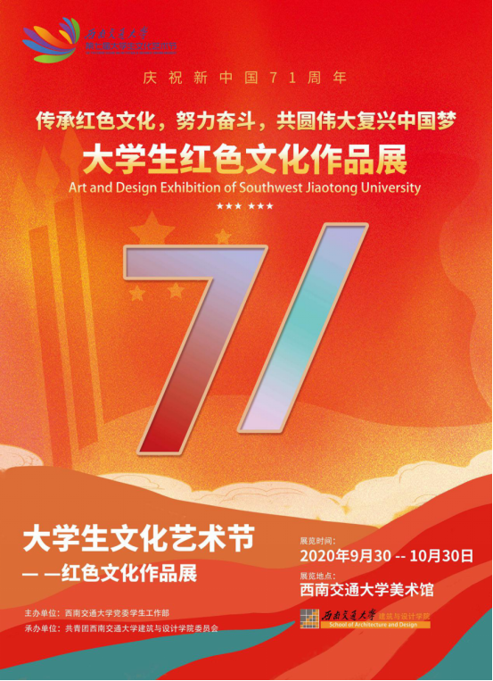 为弘扬中华民族优秀传统文化,感受交大的文化魅力,10月1日-30日由西南交通大学党委学生工作部主办,建筑与设计学院相关部门积极承办的西南交通大学第七届大学生文化艺术节 ——“岁月如歌·交大筑梦”庆祝新中国成立71周年艺术设计作品展圆满结束。