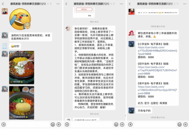 此外,院工会通过线上网络方式做好师生慰问工作,全体教职工齐心协力,共抗疫情,互相鼓励,营造和谐居家办公氛围。建筑系教工党员韩效在同事群中分享居家“煲仔饭”小妙招,鼓励大家积极应对居家办公的“枯燥”生活;机关党支部党员伍雁时刻提醒教师们的线上教学安排通知,并协助老师们做好线上授课平台的通知工作;城乡规划系副系主任唐由海老师分享小学、中学电子版课程读本,并分享上网课小技巧和经验。虽大部分教职工居家隔离,但也在网络上担任起志愿者角色,为抗击疫情贡献个人力量。
