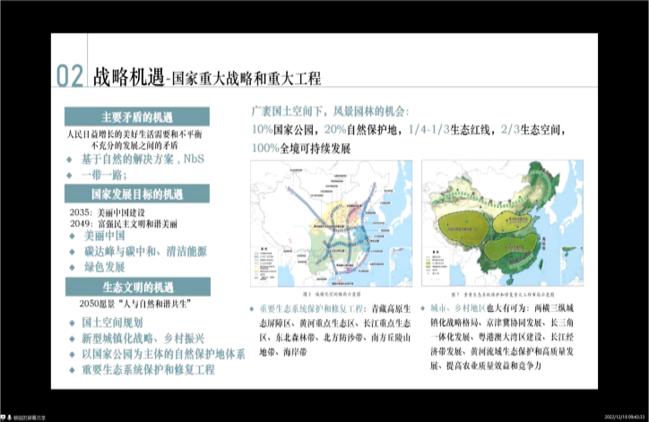张静总建筑师的报告分为风景园林设计师生态逻辑思考、“公园城市”示范区探索与实践、风景园林设计师的使命担当三个部分。其从生物多样性入手,通过探讨城市多样发展的层次,并以(山)龙泉山森林公园、龙门生物多样性博览园、(水)城市河流——驿马河和条条河的生态修复工程、(林)什邡市国家储备林建设项目、(田)天府绿道,(湖)兴隆湖水生态综合提升等工程为例,探讨景观设计师如何切入生态修复和生物多样性的表达。