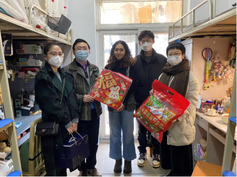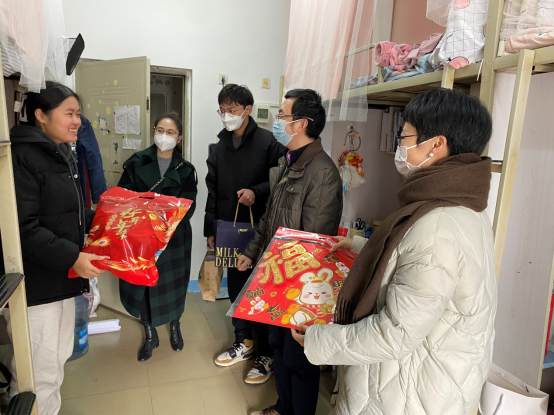 学院党委副书记刘一杰和各位老师代表学院为同学们送来了春节大礼包,同时表示,学院也将根据留校学生的实际情况,给予相应的关怀与帮助,努力做到给同学们营造家的温馨氛围。
