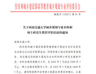 通知中讲到,经住房和城乡建设部高等教育城乡规划专业评估委员会全体会议讨论并投票表决,同意考查小组对西南交通大学城乡规划专业的考查报告,决定通过西南交通大学城乡规划专业本科和硕士研究生教育评估,本科合格有效期为6年,自2022年5月起至2028年5月止,硕士合格有效期为6年,自2022年5月起至2028年5月止。