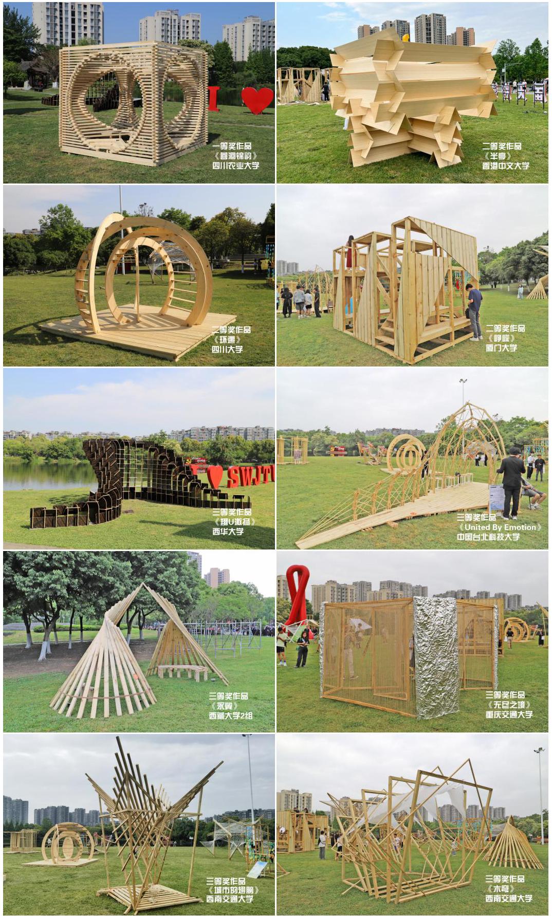 最终四川农业大学作品《蓉洄锦韵》荣获一等奖;香港中文大学作品《半亭》,四川大学《环遇》,厦门大学《峥嵘》荣获二等奖;西华大学《翔U激扬》,中国台北科技大学《United By Emotion》,西藏大学《永翼》,重庆交通大学《无尽之境》,西南交通大学《木穹》、《城市的翅膀》荣获三等奖;西南民族大学《意花驿世界》,西南交通大学《合》、《伏翼》、《交•蓉》、《憩梦小筑》、《幕·蓉》、《逸 绽》、《如灯明》获优秀奖;成都理工大学作品《飞跃》团队荣获最佳组织奖。