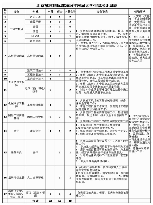 北京城建集团国际工程总承包部2014年应届大学生校园招聘启事