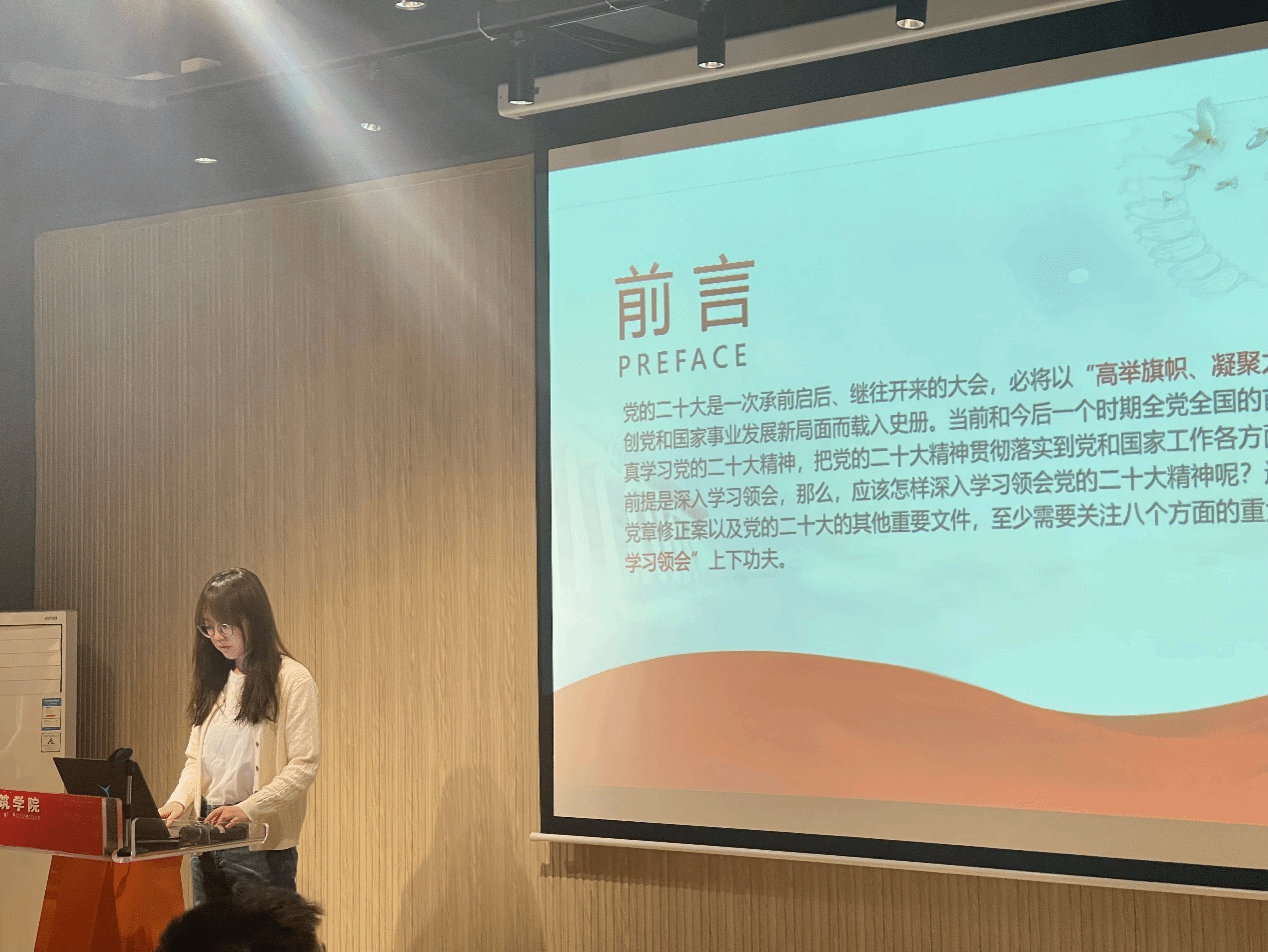 会议伊始,学生会主席张伊珺带领全体参会人员深刻学习领会党的二十大重大意义、“两个确立”的决定性意义、党的创新理论的立场和方法、以中国式现代化推进中华民族伟大复兴的使命任务等方面的内容。而后,张伊珺结合自己在伟德体育官网学生会的工作经历发表自身体会。