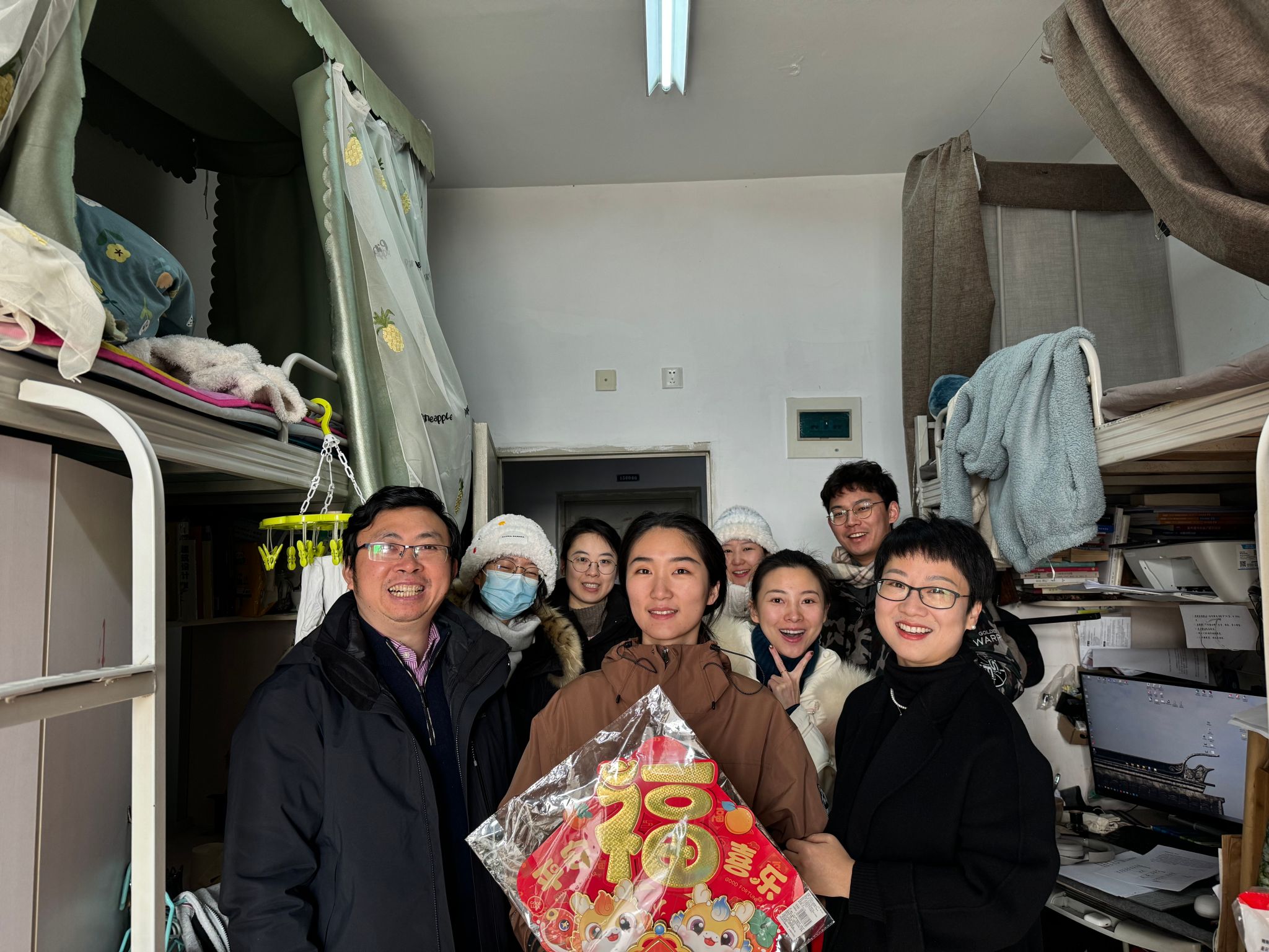 老师们集体深入学生宿舍,对留校同学表达了亲切问候,并向同学们致以新春的祝福。慰问过程中,伟德体育官网党委书记胡伟对留校学生提出了几点希望,一是希望同学们保持身心健康,保证作息,加强锻炼,多跟家里人沟通联系;二是希望同学们利用在学校的契机合理规划,努力学习,提升自我;三是希望同学们注意人身财产安全,注意寝室防火用电安全,谨防电信诈骗,度过一个温馨祥和的新年。