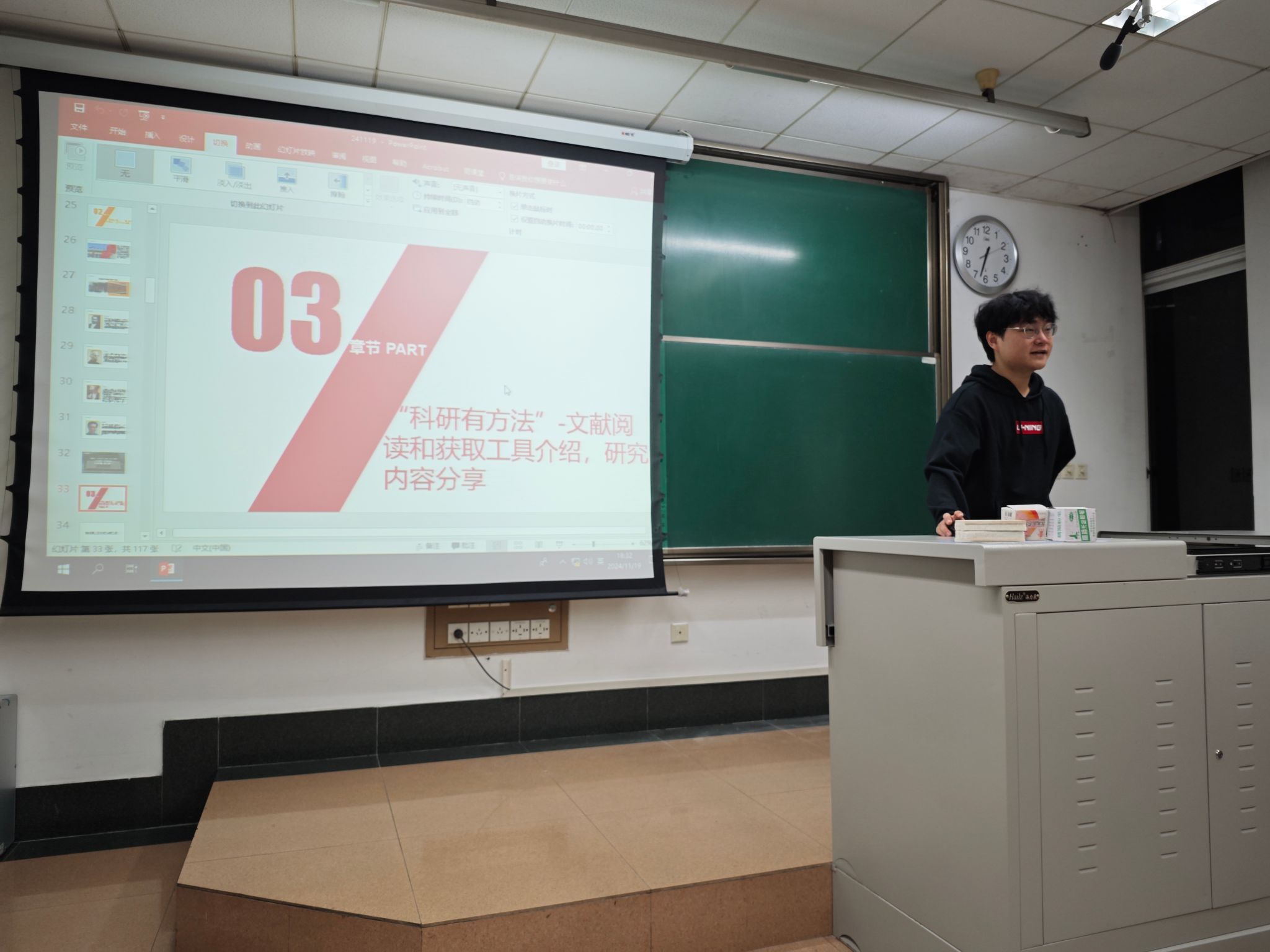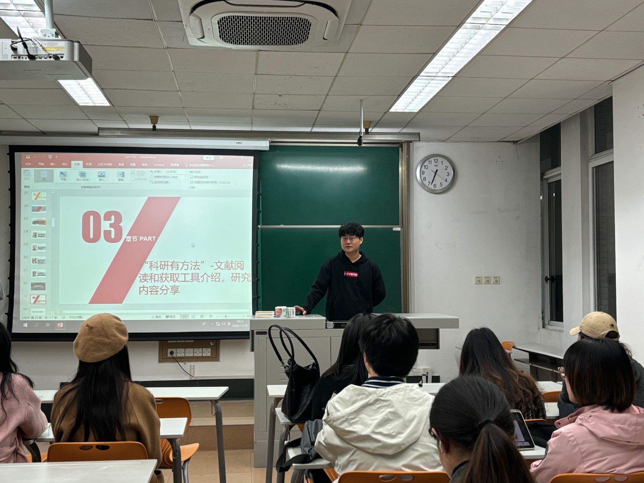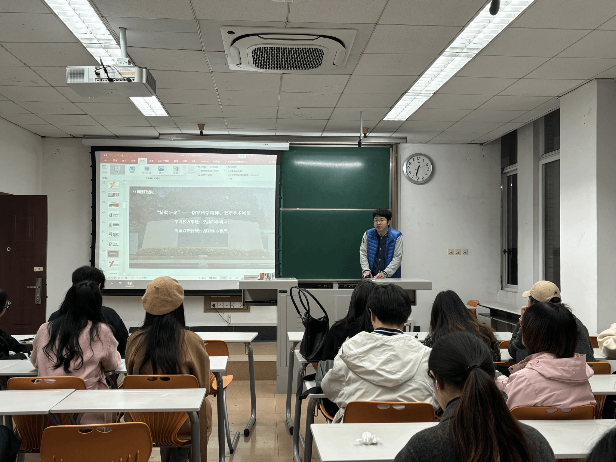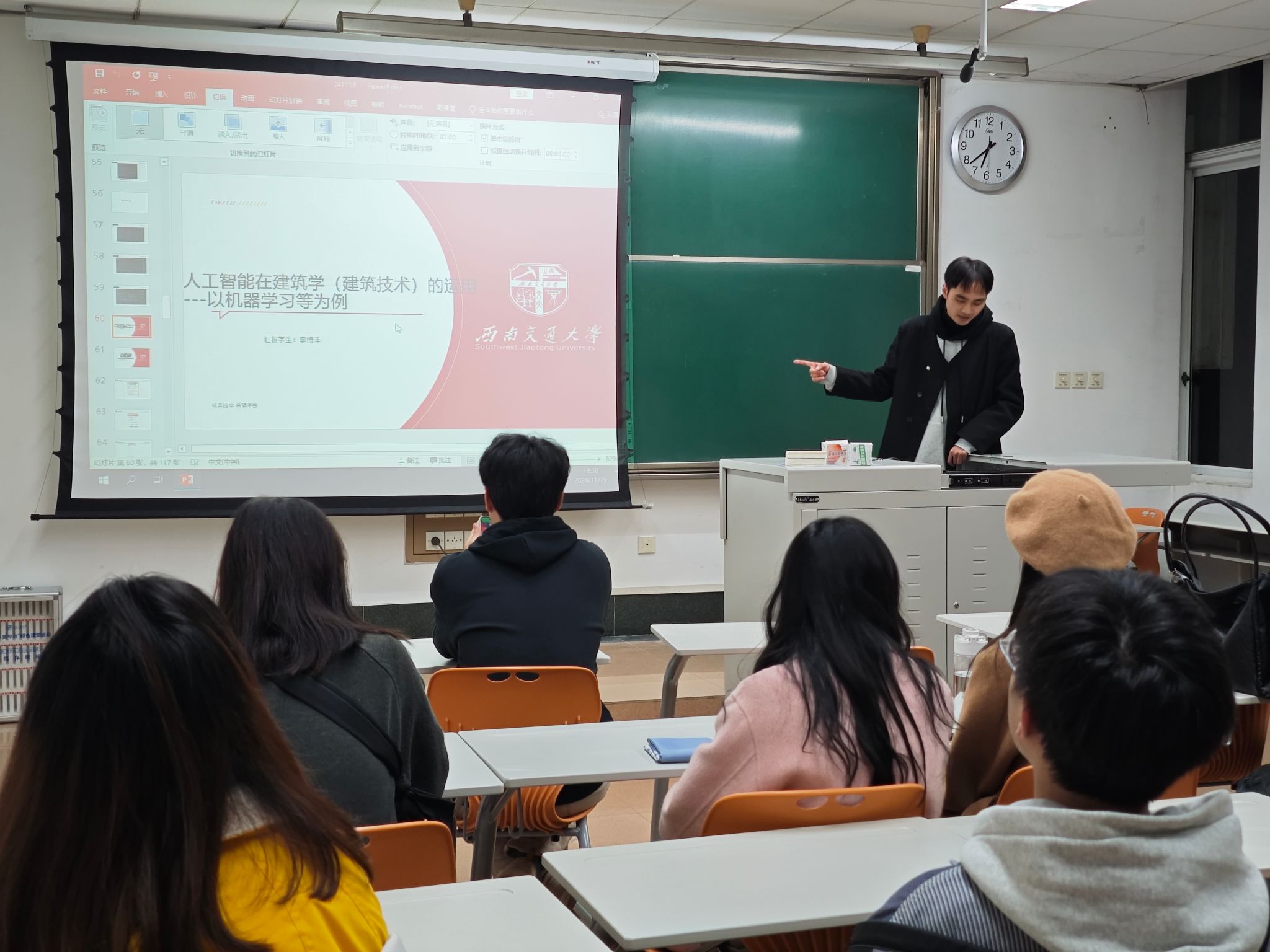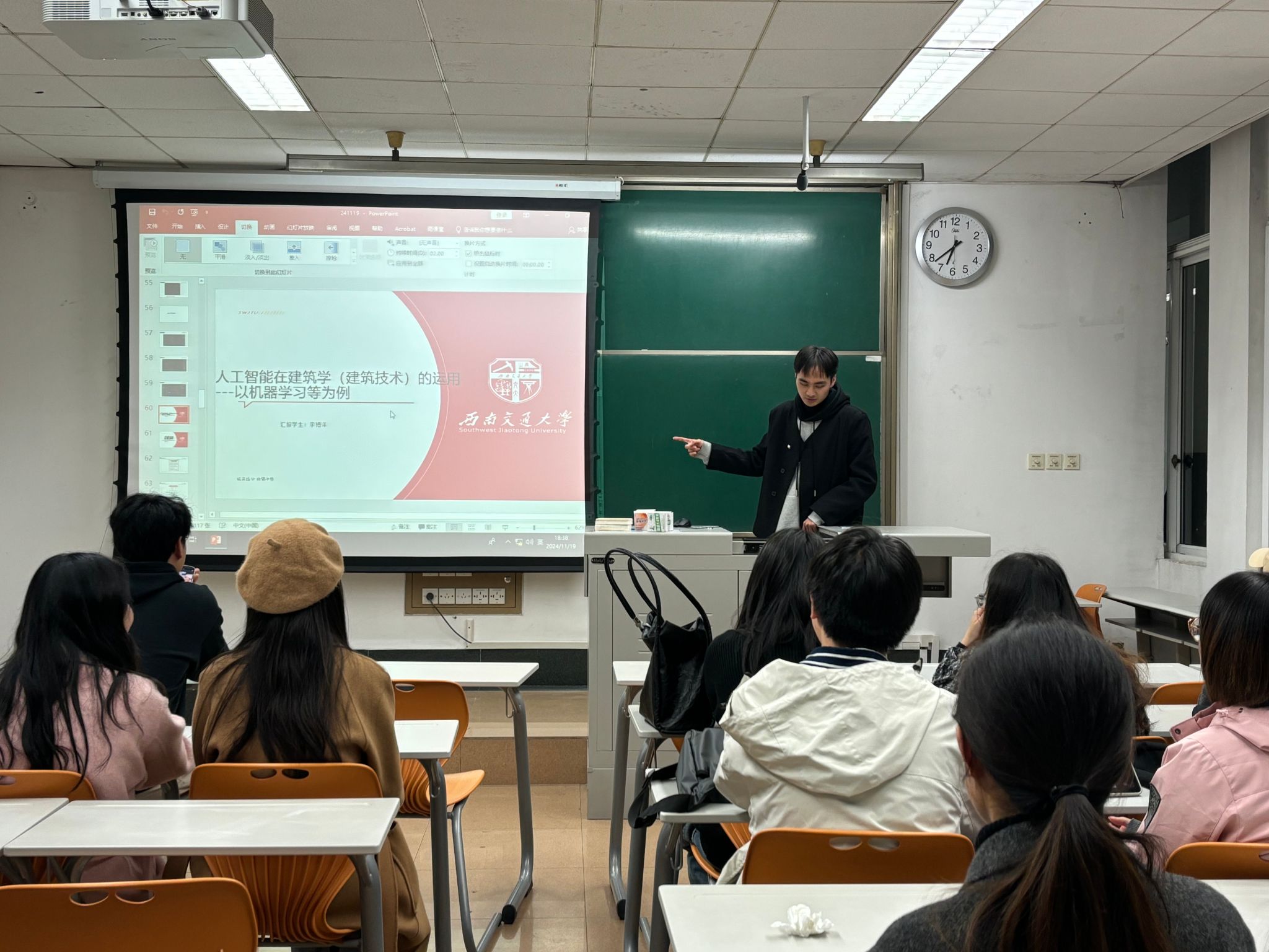 为深入学习贯彻习近平总书记关于教育强国、研究生教育的重要讲话精神。研2024级专硕2班于2024年11月19日西南交通大学九里校区4教4221教室,结合研究生“红路”理论学讲团开展“赓续奋斗精神,厚植青年担当”主题宣讲活动,开展了本班的团日活动及学术素养和科研能力提升的班会交流分享。本次班会涵盖了四个重要主题:新时代青年的责任与担当、科研工具的分享以及人工智能在建筑技术中的应用。旨在增强研究生的爱国情怀,培养科学精神以及良好的学术道德风尚,同时,为促进班级积极学习氛围,以班长为首的几名班委依次分享了一些科研工具以及前沿科研技术,从而鼓励同学互相交流学习,寻找更多科研创新点。