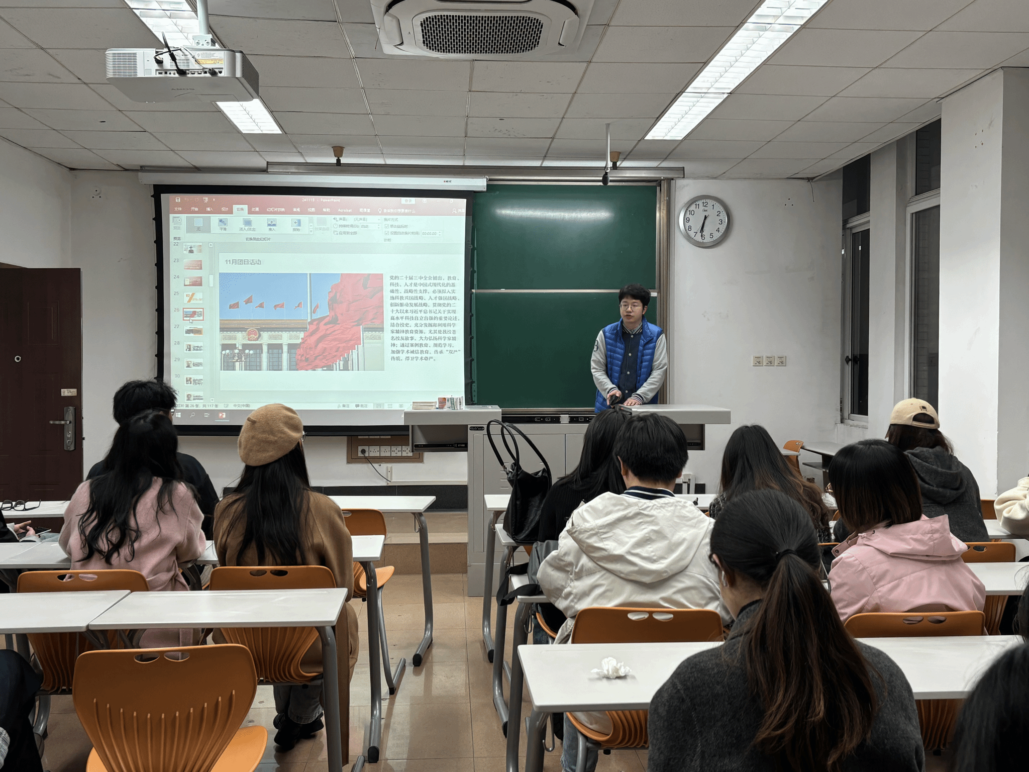 首先,由团支书主持团日活动。通过PPT分别介绍了历史以及当下一些青年磅礴力量,也激发了同学们的责任与担当。作为青年学生,我们应当坚定理想信念,厚植家国情怀,将个人的奋斗融入国家的发展大局中。