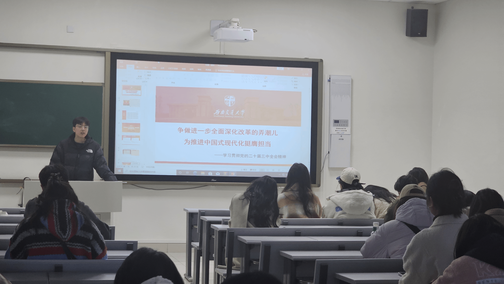 随后,王振世老师结合当下全球政治经济形势及中国的发展现实,深入分析了全面深化改革的迫切需求与时代背景。他指出,青年一代的研究生群体应当以更加积极的姿态,深入参与到国家改革事业当中,争做改革的推动者、引领者与创新者。王老师特别提到,作为国家未来的“栋梁”,研究生应以实践为基础,立足学术与科技创新,为中国式现代化贡献智慧与力量。