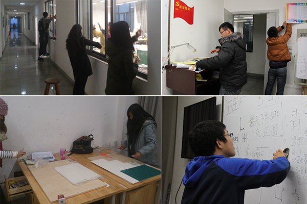 作为大一新生的同学们表示:我们虽不能立即投身祖国建设中,但是我们可以将十八大精神贯彻落实到我们的学习生活中。本次活动,各班一是对教室的卫生进行了彻底清理,同学们表示干净的教室不是在于经常的打扫清理,而是在于平时的保持,今后会更加要求自己努力维护好班级环境。二是对教室的布置按照自己的创意进行了重新规划,每个班级在墙壁上挂上了“党员示范岗”标牌、班级公示栏,有些教室设置了自然角、优秀作品展示角等。三是对桌椅的排列,根据班级教学和活动的需要排出便于师生之间交流、便于同学之间交流的模式。先进的班级不仅要具备“硬环境”的建设,同时要注重“软文化”的提升,班级“软文化”环境是班级文化环境的核心,能够展示班级风采、体现班级个性。景观班结合专业特色制作了展示班级魅力班徽,而建筑班正在编写属于自己的班歌。