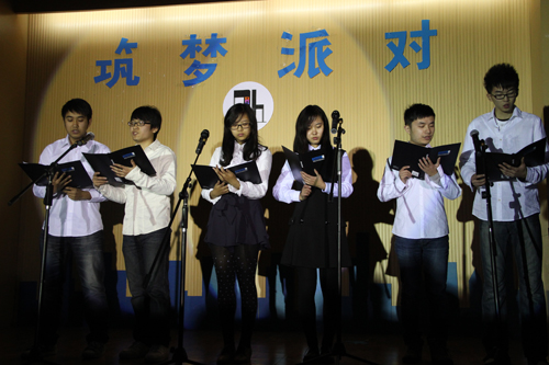 晚会一开始,由12级建筑一班带来的开场就点燃了晚会现场,紧扣今晚主题“筑梦派对”。在荧光棒与聚光灯中,08级金秋平学长的歌声显得更加深情动人。建院从来不缺人才,更从来不缺创意,古装话剧《甄嬛外传》取材于热播电视剧《甄嬛传》,同学们结合了自己平日里画图的点滴而改编的剧本,投入的表演让台下笑声掌声不断。