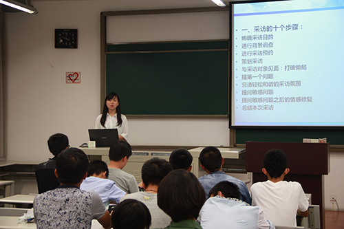 首先,康倩部长从采访步骤讲起,从很多方面出发为大家进行专访的入门培训。随后提到了电话预约要点,语言之中精炼而又不失诙谐,接着康倩从采访者和被访者两方面着重说明了采访的技巧,抓住细节详细地讲解了采访的艺术,其中蕴含的道理让媒体新人们受益匪浅,最后康倩举出了自己由一位新人成长为一名专访记者的亲身经历,结合自己的经验提出不少建议,为专访培训画上了圆满的句号。