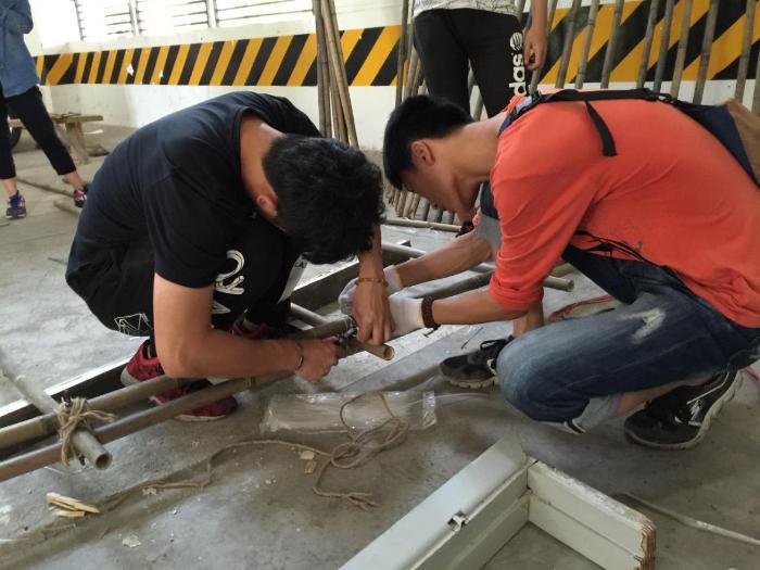 5月5日下午六点钟,在经过了昨日的准备活动以及休整后,定好的竹子等材料已经由卡车运送到了建筑与设计学院门口,大家在志愿者们的帮助下搬运和分配好了材料,开始了建造节前的初期搭建。