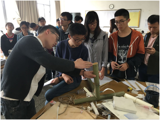 在持续约30分钟的工具介绍后,党员服务队的成员们还在现场亲自演示了“如何切出平整的竹子”、“如何做出斜切口”、“如何用电钻打孔”等技巧,还结合学生实例为他们答疑解惑,为他们解答节点制作方案等一系列问题。