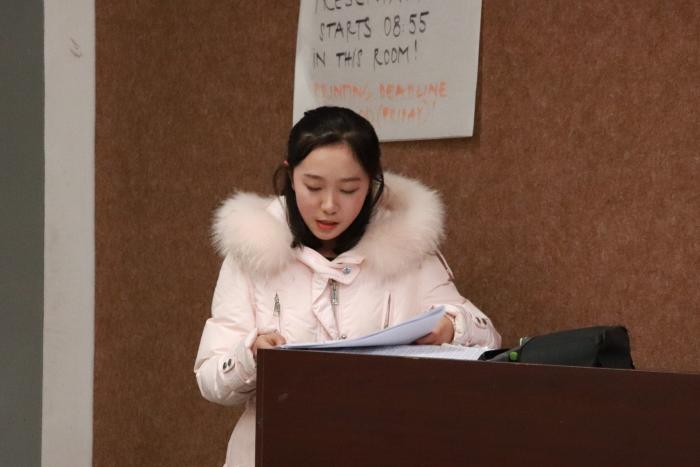 团支书张馨月主讲了十九大报告学习资料,内容以高举中国特色社会主义伟大旗帜、走中国特色社会主义道路为主题,涵盖新论断、新特点、新目标、新要求四个重要判断,坚持和发展中国特色社会主义的五个关键等内容;进一步结合了遵义会议、第十一届三中全会、十八大等历史回顾,提出并解决了“为什么必须坚持和发展中国特色社会主义”这一重要问题。在文件解读的最后,提出“让我们一起弘扬中国精神,努力建设富强民主文明和谐美丽的社会主义现代化强国!“