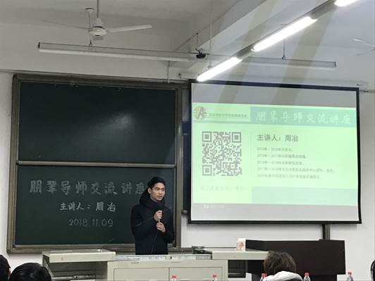 随后,朋辈导师周冶发言,他作为主讲人,以考研、保研、出国、奖学金等方面为切入点,强调了课余时间管理、未来规划、英语学科学习的重要性,并提出大一新生应在学习方面有更多注重。他为大家介绍了自己的个人经历、大学规划、以及大学期间参赛所得荣誉奖项,从自己的心路历程,到实际作法,为大家展现了更加全面的自己。他还指出,大学生活中除了专业知识的学习,还应该更多了解其他知识,使自己更加充实。参加本次讲座的同学更加深入得了解了朋辈导师的成长经历以及学习经验,收获良多。在最后的互动环节中,朋辈导师周冶对参与交流同学的问题进行了一一回答,给予了新思路以及更高层次的见解,同学们受益匪浅。