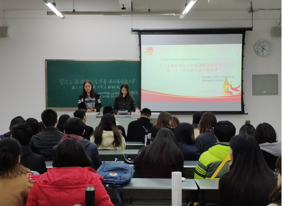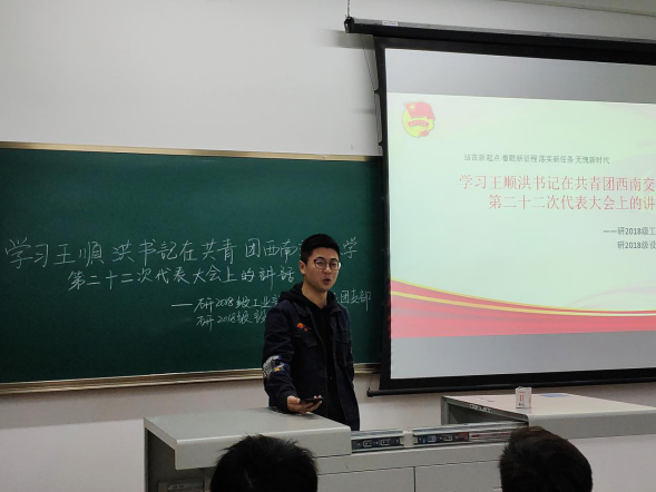 12月4日下午6:30,建筑与设计学院研2018级工业设计工程班团支部与研2018级设计学班团支部全体同学在犀浦校区X9206室举行了“学习王顺洪书记在共青团西南交通大学第二十二次代表大会上的讲话”的会议。会议由工业设计工程班团支书李钰、设计学班团支书段沁妤共同主持。本次会议旨在帮助两个班级同学深入学习王顺洪书记讲话精神,不忘初心、牢记使命,为交大共青团工作贡献自己的一份力量。