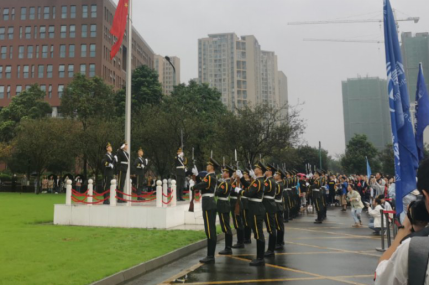 上午7点40分,团支部的学生们已早早在广场队列整齐,护旗手更是在旗杆下伫立多时。八点整,一切准备就绪,升旗仪式正式开始,国旗护卫队迈着庄严而整齐的步伐走到旗台下。“升国旗,奏国歌,全体师生行注目礼!”伴随着庄重嘹亮的国歌,五星红旗冉冉升起。同学们怀着激动的心情,摇晃着手中的旗帜,自豪的在国旗下合影留念。