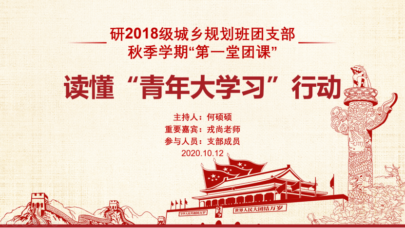2020年10月12日上午10时,西南交通大学建筑与设计学院研2018级城乡规划班团支部在线上开展了以“读懂‘青年大学习’行动”为主题的“秋季第一堂团课”活动,由团支部书记何硕硕同志主持,辅导员戎尚老师参与本次团课。