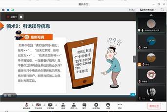 2021年3月28日20:00在腾讯会议开展线上班会,首先班长陈功同学对近期班级安排进行阐述,提醒在外实习注意自身安全与防疫保护。随后邀请学习委员乔娇娇同学分享如何预防电信网络诈骗小知识,从电信诈骗的本质、特点、常见形式到如何识别防范和受骗后何以解决等方面进行了深入的讲解,保证大家可以防患于未然,保护好自身的财务安全,避免进入诈骗圈套。防骗小知识风向后,同学们踊跃发言,把自己遇到过的、看到过的骗局分享给大家,这不仅让同学们深入了解电信网络诈骗,更能最大可能防范、保护财产安全。之后生活委员冯生同学对艾滋病、结核病等重大传染病的防治与大家分享,说明病毒本质、病程、传播途径,再加之成都是艾滋病的高发区,感染率偏高,深入讲解预防疾病的对策,保证自身的身体健康。