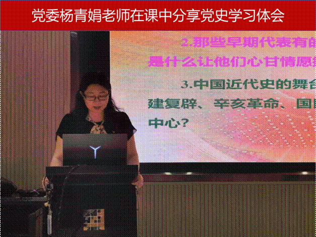 首先,杨青娟老师带领大家重温入党誓词,牢记初心使命。第二部分,杨老师以“开天辟地”、“改天换地”、“翻天覆地”、“惊天动地”四个关键词介绍了中国共产党的发展史,并结合自身学习《毛泽东选集》的心得体会,阐述了中国共产党的先进性。随后,杨青娟老师以纪录片《朝鲜战争》中的片段,生动介绍了中国共产党不畏艰难,百折不挠的崇高精神。最后,杨老师结合疫情期间的感人案例和《那兔那鹰那国》的文艺作品,阐述了对“中国共产党因何而伟大”这一问题的理解。