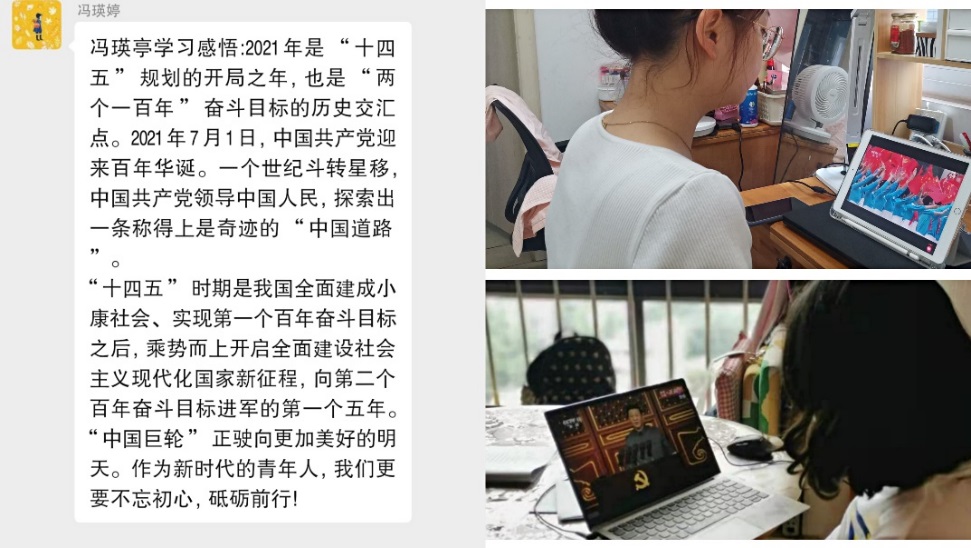 会上,党支部书记李聪同志带领大家重温了中国共产党百年征程中的光辉历史,希望各位党员同志始终保持对中国共产党事业的无限热情,珍惜现在来之不易的美好生活,努力学习,排除万难,为实现中华民族伟大复兴贡献力量。研工业设计党支部全体成员在线收看庆祝中国共产党成立100周年大会,并通过微信群等线上交流方式,表达了自己的学习感想与感悟。