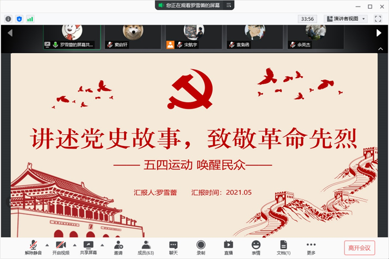 2021年5月13日19:30时,研建筑学专硕党支部于腾讯会议线上平台召开组织生活会,与会人员有研建筑学专硕党支部全体党员及部分积极分子。会议对党史进行了深入的学习,学习主题为“讲述党史故事,致敬革命先辈”,学习内容分为”五四运动,唤醒民众”和“反帝反封,工运高潮”两个部分。本次组织生活会由贺盈乾同志主持。