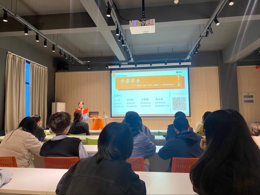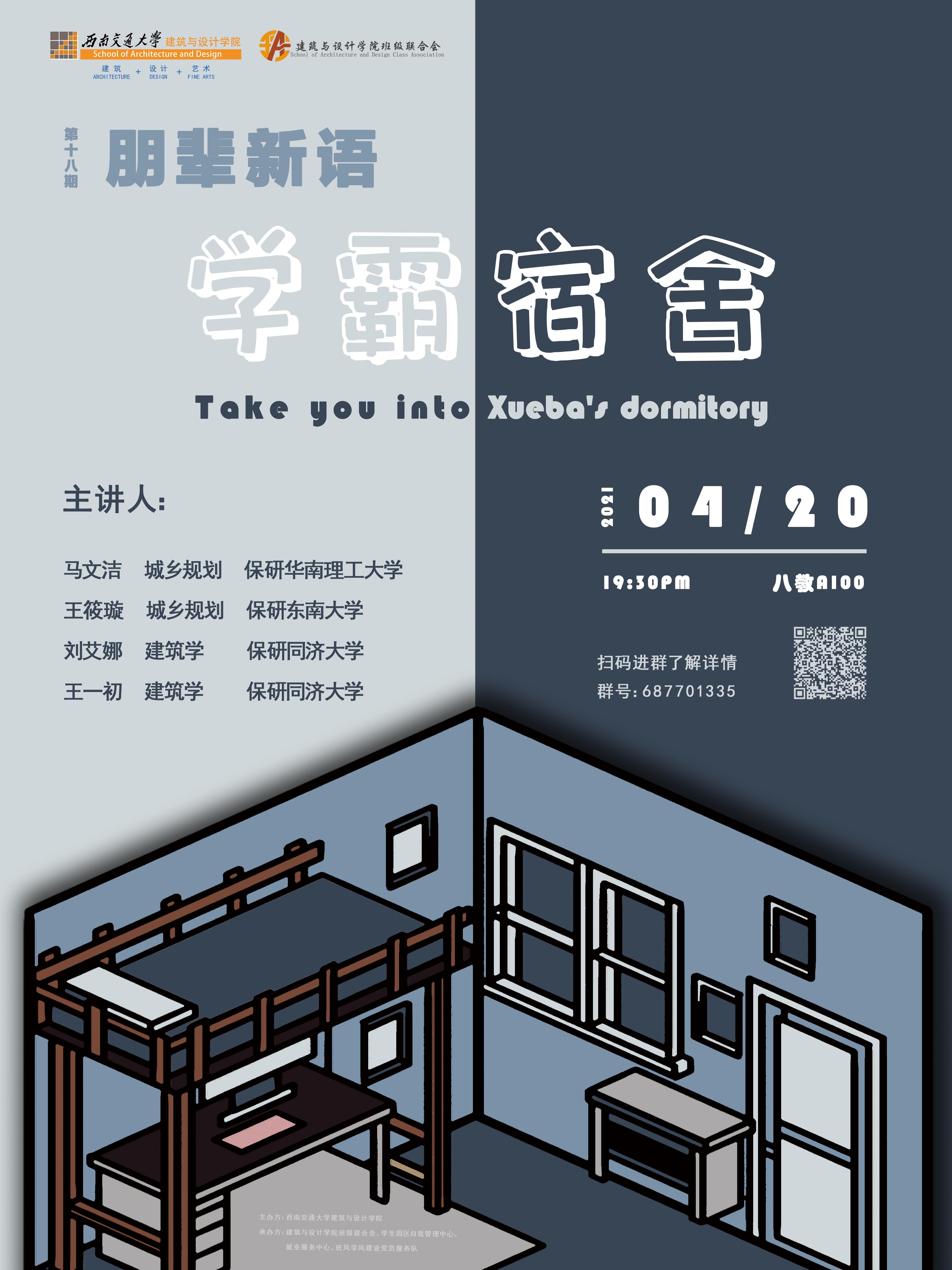 为了帮助同学了解保研、竞赛、科研和评奖评优信息,更好地调动同学学习的热情。2021年4月20日晚19:30,由西南交通大学建筑与设计学院主办,建筑与设计学院班级联合会、学生园区自我管理中心、就业服务中心、班风学风建设党员服务队承办的朋辈新语‘学霸宿舍’在八教A100报告厅顺利进行。本次活动我们邀请到了‘学霸宿舍’的四位学姐,她们分别是来自建筑学专业的刘艾娜、王一初和来自城乡规划专业的马文洁、王筱璇学姐。